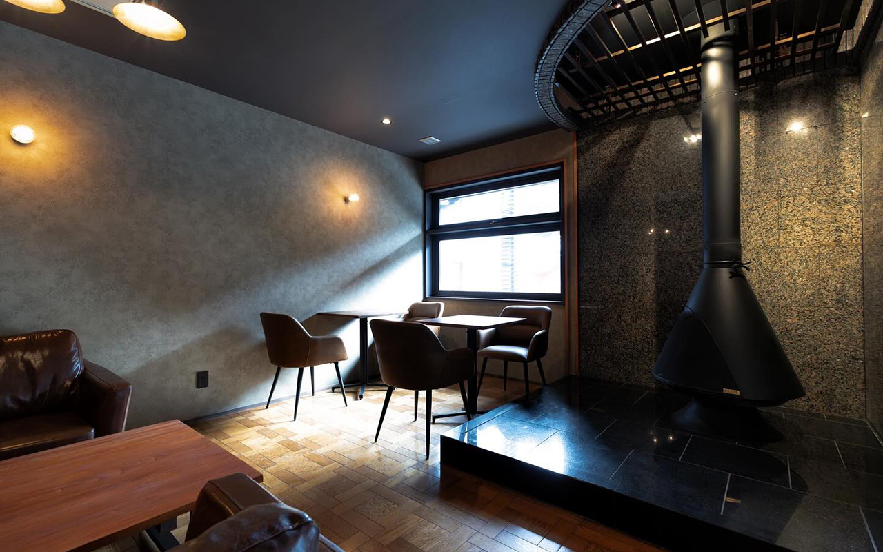 一歩足を踏み入れると、まず目を奪われるのは、重厚で立派な梁(はり)が巡る圧巻の空間。贅沢な一枚板のカウンター、特注の巨大な木製照明、そして空間の主役とも言える大きな暖炉が、古民家の持つ温もりとモダンなデザインを見事に融合させています。