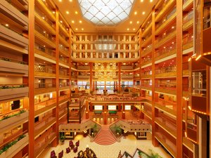 最大の見どころは、豪華絢爛な吹き抜けのロビー。まるでパイプオルガンのように配置された階段やシースルーエレベーターが輝く空間は、ジブリ映画『千と千尋の神隠し』の湯屋のモデルになったとも言われ、その荘厳な雰囲気に一行も圧倒されていました。 空中庭園露天風呂や多彩な客室、そして和洋中100種以上の豪華ブッフェも人気の理由です。